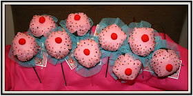Así que me puse manos a la obra y este fue el resultado, 9 diademas Cupcakes de fielto en rosa y marrón, decoradas con un pequeño pompón rojo y abalorios de diferentes colores. La blonda de las tartas es de tul azul.